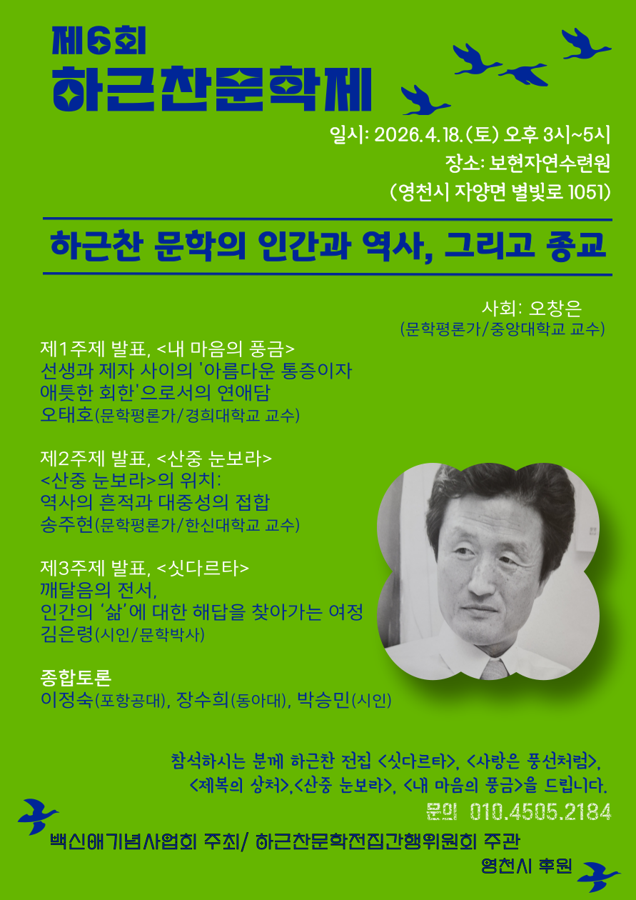 곧 발간될 예정인 하근찬 전집 6차분을 기념하여 제6회 하근찬 문학제가 개최됩니다. 올해는 영천시의 보현자연수련원에서 열릴 예정인데요. 참석하셔서 영천시의 풍경과 함께 하근찬 문학에 대해 이야기 나누는 시간을 가져보는 것도 좋겠습니다.
