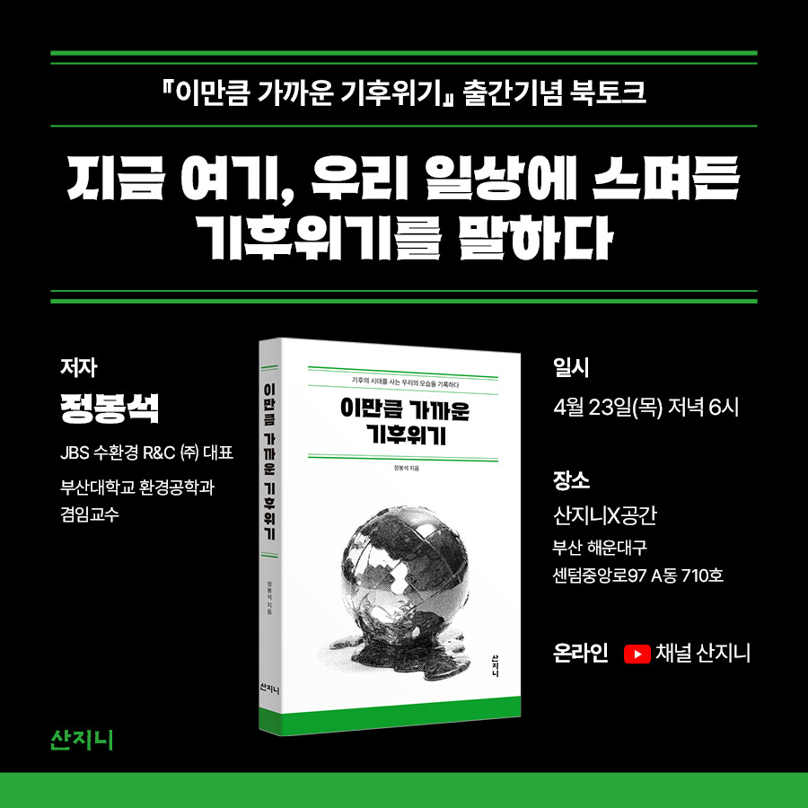 오는 4월 23일 목요일, 부산대학교 환경공학과 겸임교수 정봉석 저자와 함께 우리 일상 속으로 스며든 기후위기의 현상에 관해 이야기 나누고자 합니다. 뉴스에서 들려오는 폭우와 산불, 홍수 소식에 무감해져서는 안 된다고 생각하고 있으셨다면, 기후위기가 지구 곳곳에 어떤 변화를 불러오고 있는지 궁금하셨다면 이번 행사가 기후와 환경에 대한 관심을 넓힐 기회가 될 수 있을 것입니다. 예측할 수 없는 위기 속에서도 희망을 찾고 있는 여러분을 <이만큼 가까운 기후위기> 북토크에 초대합니다🌳 |