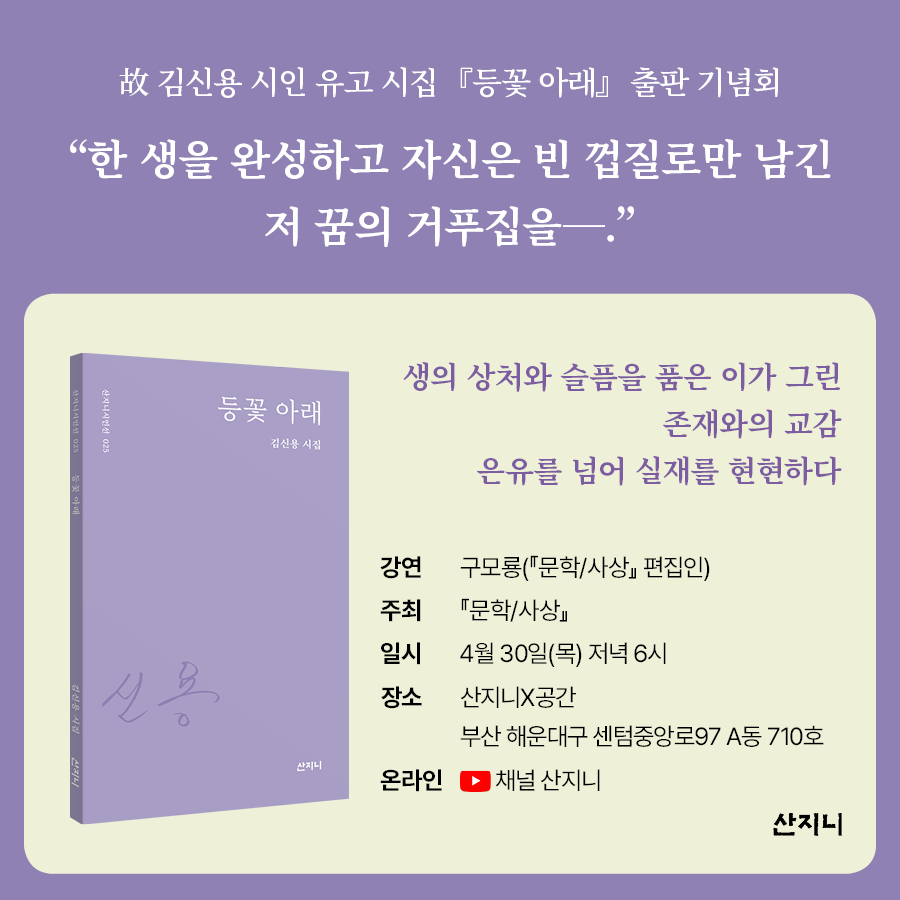 <등꽃 아래>의 해설을 쓴 구모룡 평론가와 함께 김신용 시인의 마지막 시집에 대한 이야기를 나누고자 합니다. 서로가 서로의 벽이 되어주는 혼신의 포옹을 그리고자 했던 김신용 시인을 함께 기억하는 시간이 되면 좋겠습니다. |
