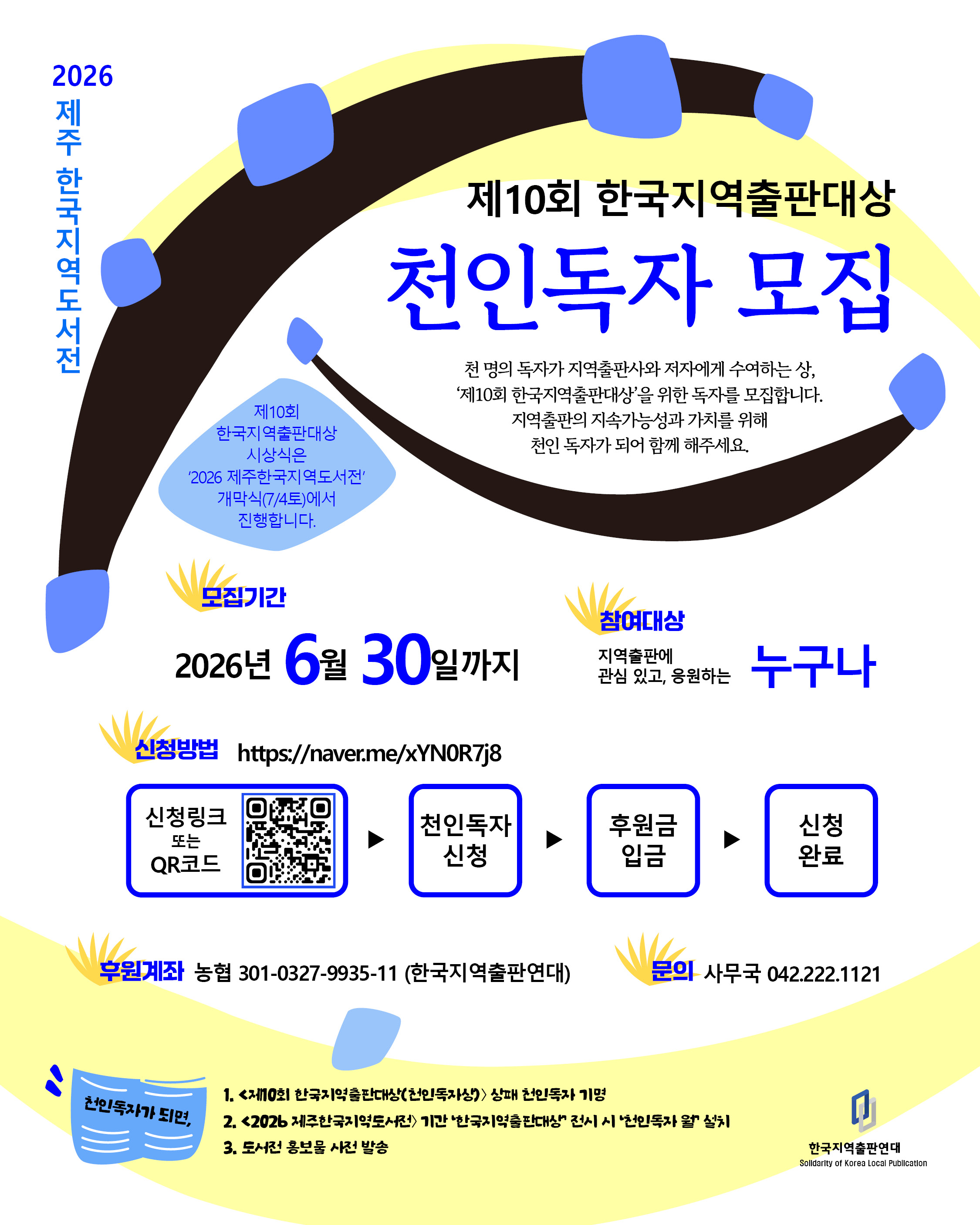 ✔ 참여대상: 지역 출판에 관심 있는 누구나 ✔ 모집기간: 2026년 6월 30일까지 ✔ 후원계좌: 농협 301-0327-9935-11 한국지역출판연대