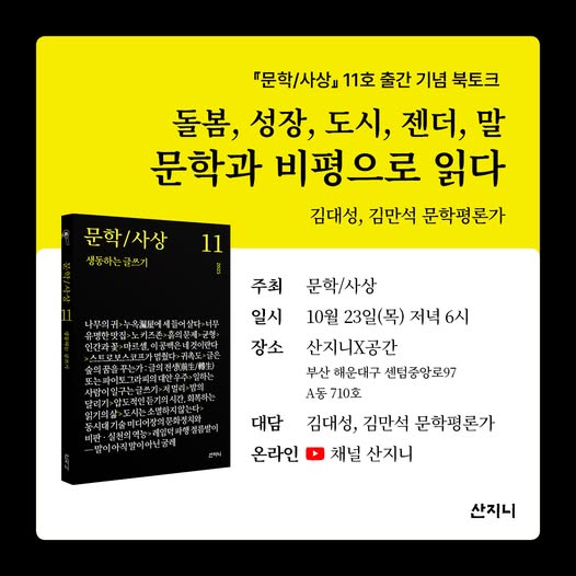 주류 담론에 반격을 가하고, 담론의 지형을 재구축한다는 취지로 2020년 6월 창간한 문예비평지 <문학/사상>이 11호를 맞이하였습니다. 이번 11호에서는 ‘돌봄, 성장, 도시, 젠더, 말’이라는 키워드를 문학과 비평의 시선을 통해 다시 들여다봅니다. 문학과 비평은 이처럼 크고 추상적인 단어들 속으로 어떻게 파고들며, 그 틈새를 우리 앞에 어떻게 드러내 보일 수 있을까요? 궁금하신 분들은 꼭 북토크에 오시기를요!