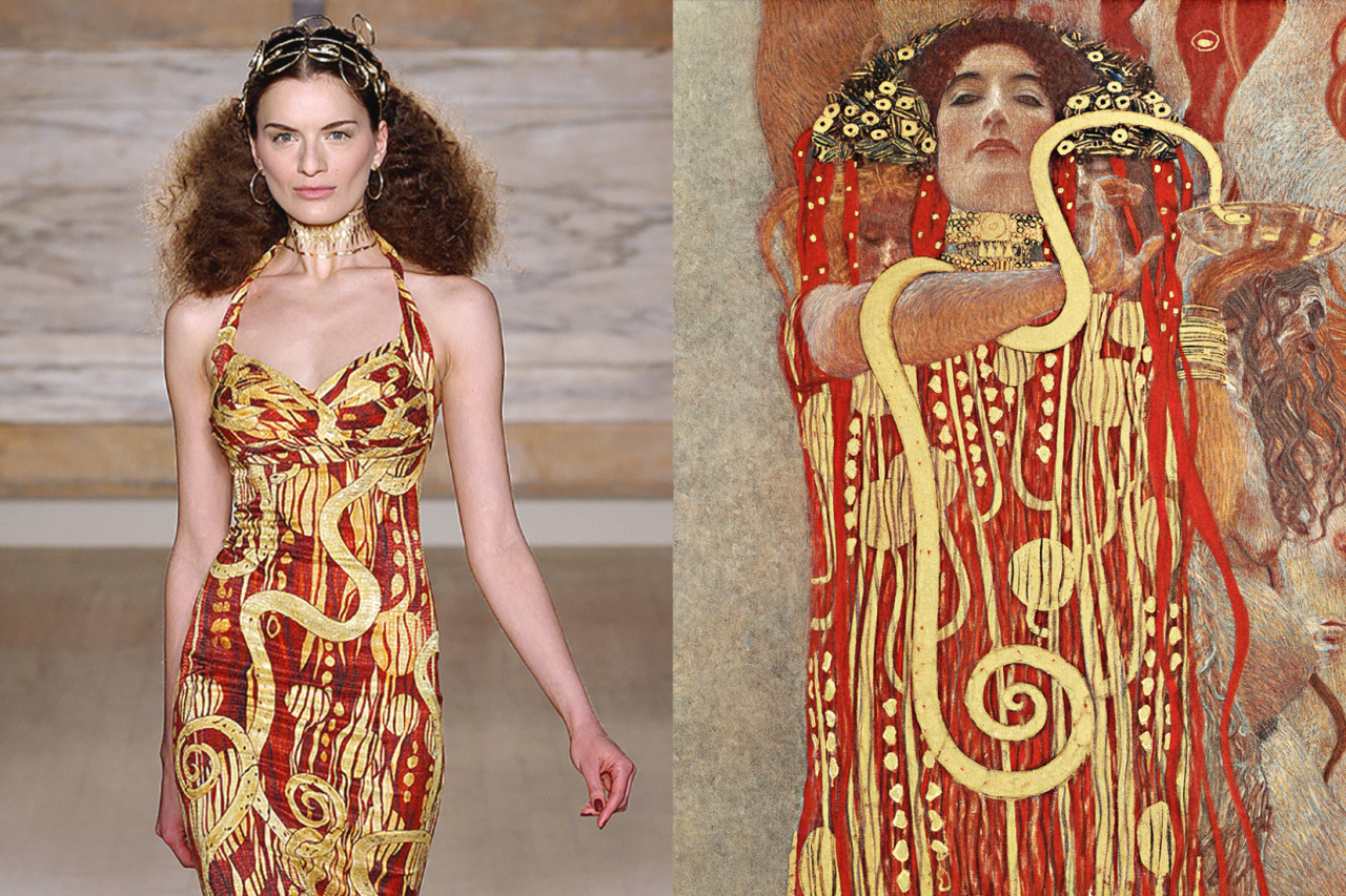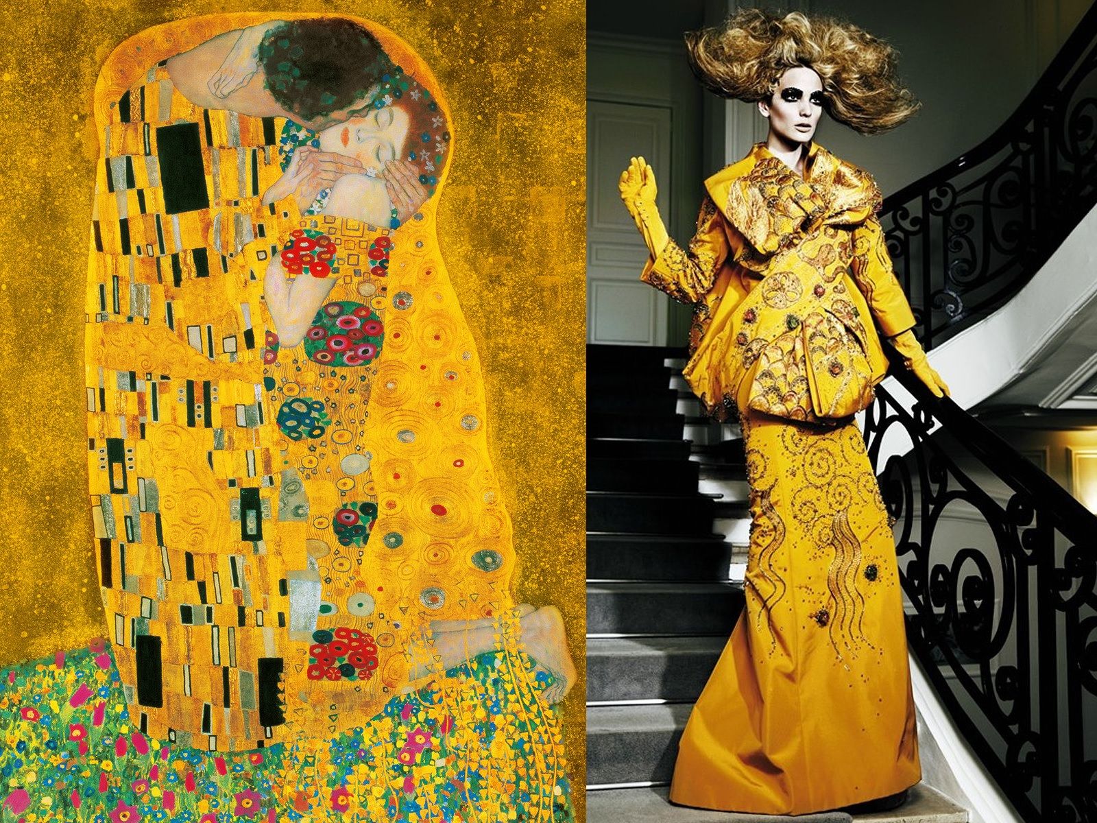 클림트는 금 세공가였던 아버지의 영향으로 금박, 은박을 작품에 사용했고, 넝쿨과 같은 곡선 그리고 기학학적 문양을 활용하여 장식성이 돋보이는 의상을 작품에서 선보입니다. 클림트 작품 속 인물들의 의상은 세계적인 패션 디자이너들에게 영감을 주었습니다. <패션, 영화 속 미술을 그리다>에는 클림트의 작품이 어떻게 패션 의상으로 재탄생되었는지 확인할 수 있습니다. 런웨이 위의 모델들이 마치 회화작품을 입고 걸어가고 있다고 해도 과언이 아닐 정도로 예술 작품에서 영감을 얻은 패션 컬렉션들이 정말 많았습니다. |