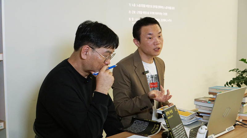 지난 10월 23일, 산지니X공간에서 <문학/사상> 11호 출간 기념 북토크가 열렸습니다. 이번 북토크에서는 <문학/사상>의 편집위원인 김대성, 김만석 문학평론가와 함께했습니다. 김대성 평론가가 집필한 11호의 특집 원고 ‘일하는 사람이 일구는 글쓰기’를 중심에 놓고, 잘 보이지 않는 곳에서 끈질기게 흐르고 있는 ‘일하는 사람들이 쓴 글’을 뭐라고 부를지, 어떻게 이어지고 있는지를 여러 책들과 사례를 통해서 짚는 시간을 가졌습니다.