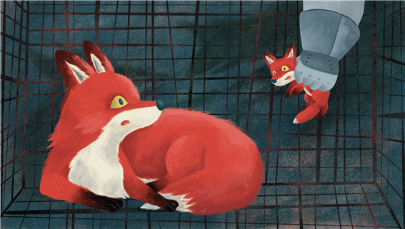 <엄마가 보고 싶은 아기 여우, 아기가 보고 싶은 엄마 여우>에는 이 아픈 현실이 잘 그려져 있습니다. 책의 첫 장면에서 엄마 여우는 아기 여우와 꼭 붙어 행복한 표정을 짓고 있습니다. 그러나 인간의 손이 나타나 아기 여우를 데려가는 순간, 배경은 차가운 철장으로 바뀌며 이곳이 우리임을 드러내죠.