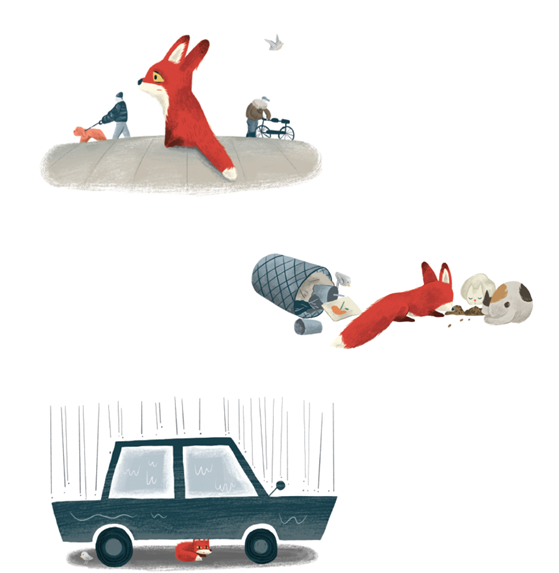 한편, 책의 반대편에서는 아기여우가 어디론가 운송되던 중 도시 한복판에 떨어집니다. 아기 여우는 엄마를 그리워하며, 도시 곳곳의 ‘주황색 털’을 따라 다닙니다. 아기 여우의 녹록지 않은 모험은 도시 환경이 야생동물에게 얼마나 위험한지를 보여줍니다. 실제로 유럽의 몇몇 도시에서는 야생 여우가 살고 있는데, 이 여우들의 평균 수명은 자연에 사는 여우의 절반밖에 되지 않는다고 합니다. |