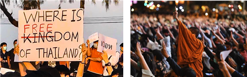 이 갈등을 넘어 등장한 정당이 아나콧마이당입니다. 노란색과 빨간색을 섞은 오렌지색을 내세운 이 정당은 개혁의 상징으로 떠올랐고 젊은 세대의 인기를 한 몸에 받습니다. 그렇지만 이 정당은 탁신 계열에도 군부에도 눈엣가시였습니다. 결국 2019년 총선 이후 정치보복이 이어졌고 2020년 헌법재판소 결정으로 해산됩니다. 분노한 청년들은 거리로 쏟아져 대규모 시위를 벌였습니다. 이 시위에서 그동안 금기시되던 ‘왕실 개혁’에 대한 이야기가 터져 나왔고 사람들은 ‘왕실 모독죄’ 폐지와 민주주의를 외쳤습니다.