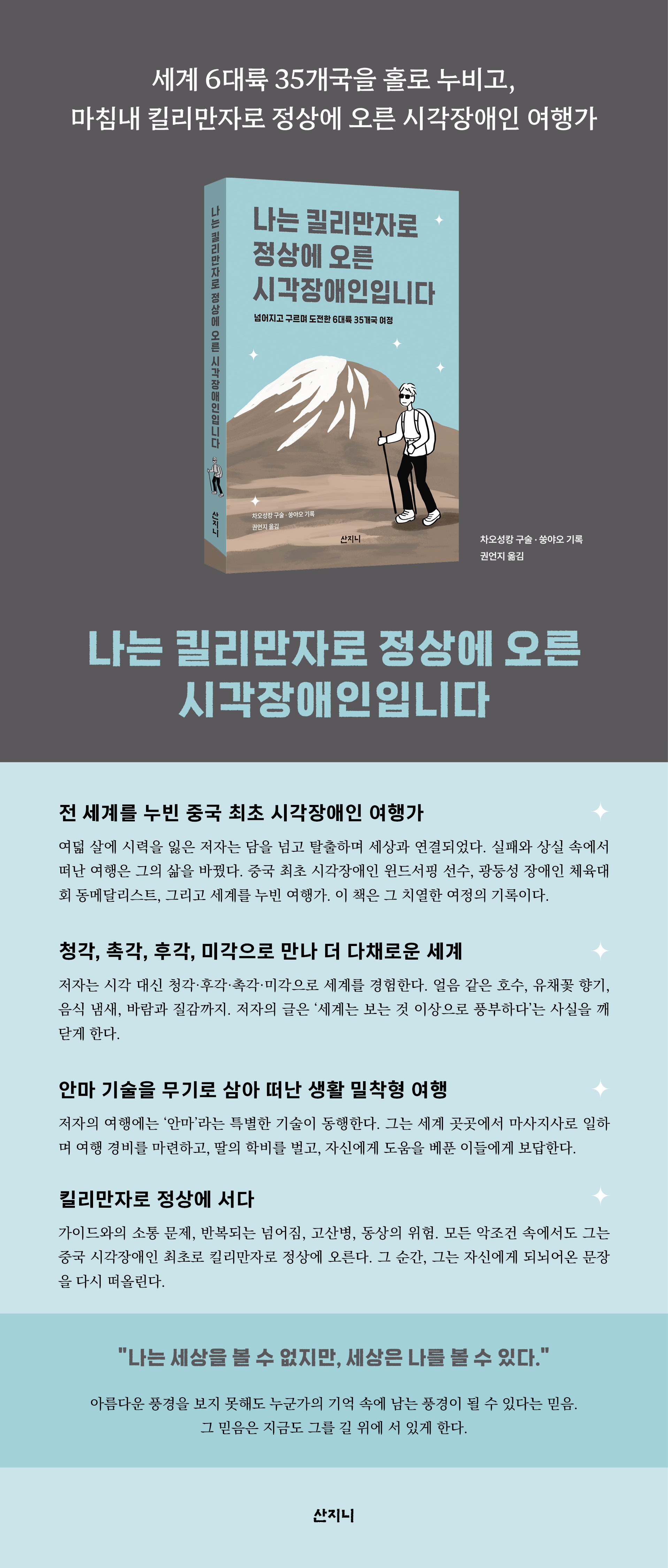 저자는 마침내 킬리만자로 정상에 오릅니다. 수없이 넘어지고, 고산병과 추위에 시달리며, 끝까지 만류를 받았던 여정의 끝에서 그는 중국 최초의 시각장애인 킬리만자로 등반자가 됩니다. 그러나 정상에서 그가 발견한 것은 단순한 성취가 아닙니다. “나는 세상을 볼 수 없지만 세상은 나를 볼 수 있다.” 이 문장은 이 책 전체를 관통하는 선언처럼 남습니다. 아름다운 풍경을 보지 못해도, 누군가의 기억 속에 남는 풍경이 될 수 있다는 믿음. 그것이 그를 다시 길 위로 나아가게 합니다.